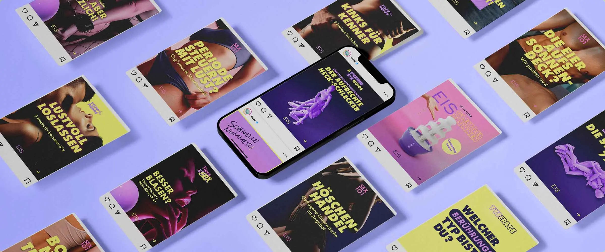 Zwischen Postings, Redaktionsplänen und Reportings entwickeln wir Sonderaktionen und beraten EIS.de umfänglich und tagesaktuell zu Meta. Damit sorgen wir seit über 2 Jahren dafür, dass der Instagram Kanal von EIS.de der reichweitenstärkste deutschsprachige Kanal im Bereich Sexual Wellness bleibt.